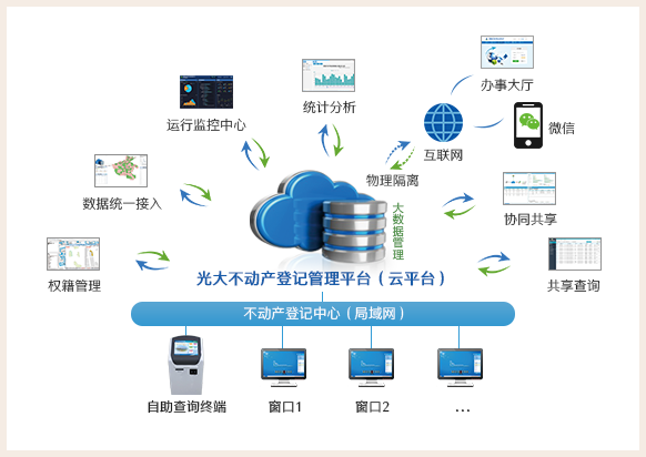 光大不動(dòng)產(chǎn)登記綜合管理平臺(tái)是根據(jù)《不動(dòng)產(chǎn)登記暫行條例》、《不動(dòng)產(chǎn)登記暫行條例實(shí)施細(xì)則》等不動(dòng)產(chǎn)登記標(biāo)準(zhǔn)研發(fā),面向不動(dòng)產(chǎn)統(tǒng)一登記機(jī)構(gòu)的政務(wù)辦公系統(tǒng),是“登記機(jī)構(gòu)、登記簿冊(cè)、登記依據(jù)、信息平臺(tái)”四統(tǒng)一中“信息平臺(tái)統(tǒng)一”的具體實(shí)踐,是不動(dòng)產(chǎn)登記各項(xiàng)制度落實(shí)和信息共享的技術(shù)基礎(chǔ)。平臺(tái)提供了不動(dòng)產(chǎn)權(quán)籍管理、登記業(yè)務(wù)管理、統(tǒng)一接入及上報(bào)管理、協(xié)同共享管理、共享查詢查理、公眾查詢管理、統(tǒng)計(jì)分析管理等方面的服務(wù)應(yīng)用,消除了不動(dòng)產(chǎn)登記中的“信息孤島”、提高工作效率、提升群眾滿意度,是不動(dòng)產(chǎn)登記信息化建設(shè)的重要產(chǎn)物。